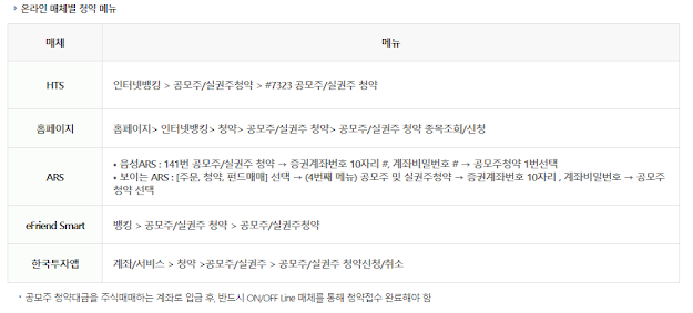 위에 말씀드린 배정받은 증권사의 HTS, 지점방문을 통해 청약 신청이 가능합니다.