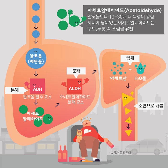 술은 체내에 흡수되어 아세트알데하이드로 변하는데,