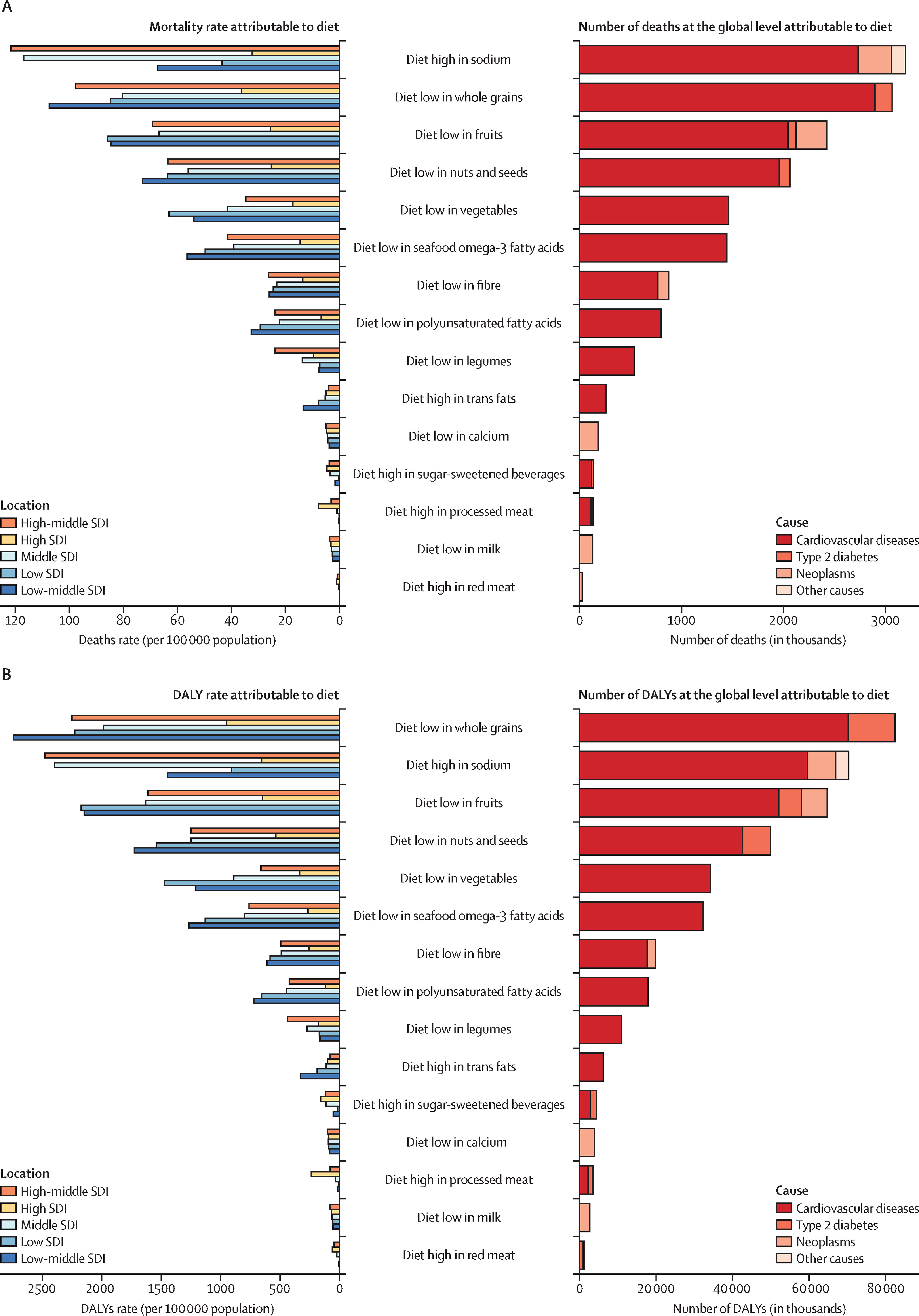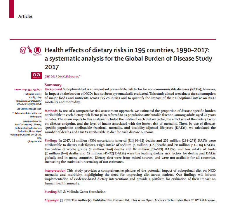 이 연구는 식사습관이 사망에 미치는 영향을 연구하기 위해 시작되었는데, 195개국에서 1990년부터 2017년에 걸친 데이터를 조사한결과를 바탕으로 15개의 식사습관이 사망에 미치는 영향에 대해 연구를 한 대규모 조사입니다. Global Buren of Disease(GBD) study의 일환으로 사망에 이르게 하는 여러가지 위험요소(risk)를 규명하고 정책에 반영하기 위해 연구하고 있습니다.