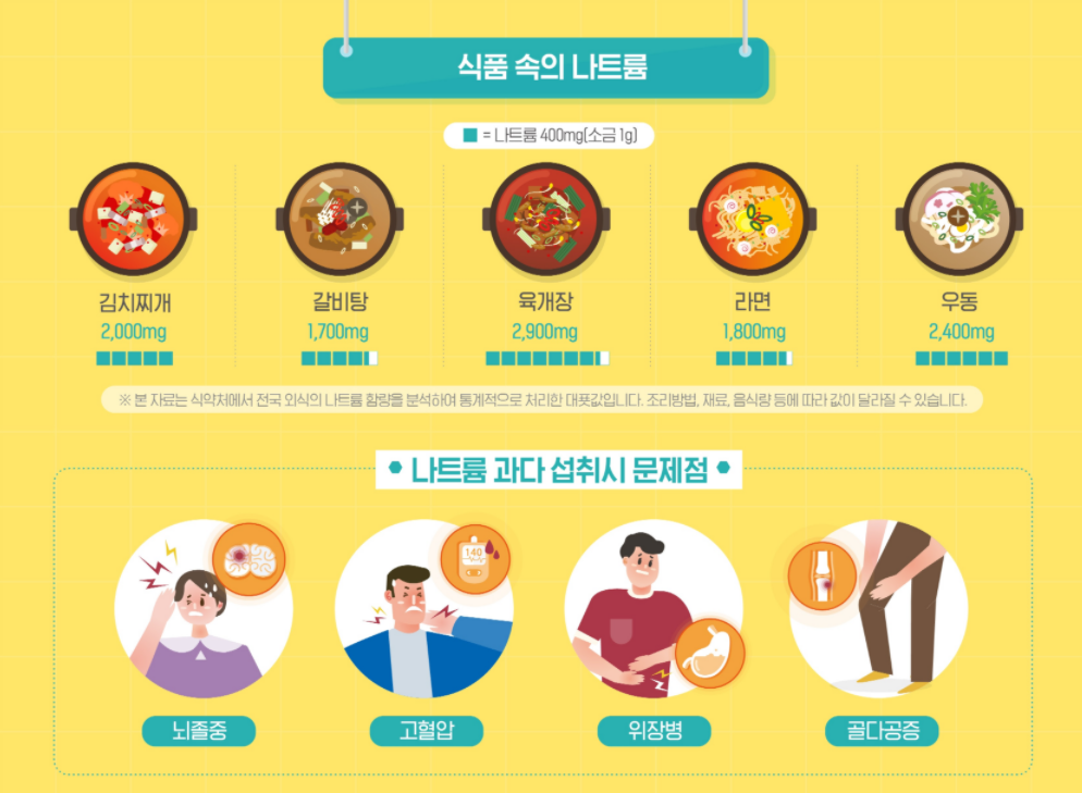 나트륨은 하루에 2000mg정도를 섭취하도록 권고되는데, 보통 소금으로 많이 이야기 됩니다. 소금 1g에는 나트륨 400mg 정도가 들어있다고 생각하시면 될 것입니다. 우리가 먹는 김치찌개에는 나트륨 2,000mg, 육개장 2,900mg, 우동 2,400mg 이나 들어있어 한끼만 먹어도 일일권장량을 초과하게 됩니다. 이렇게 과다하게 나트슘 섭취가 계속될 경우 '뇌졸중', '고혈압', '위장병', '골다공증'등의 증상이 나타날 수 있습니다. 따라서 소금 대신 천연향신료를 사용하고, 국과 찌개의 국물을 적게 먹고 우유와 채소를 섭취하는 등 나트륨 섭취를 의식적으로 줄이려고 노력해야 합니다.
