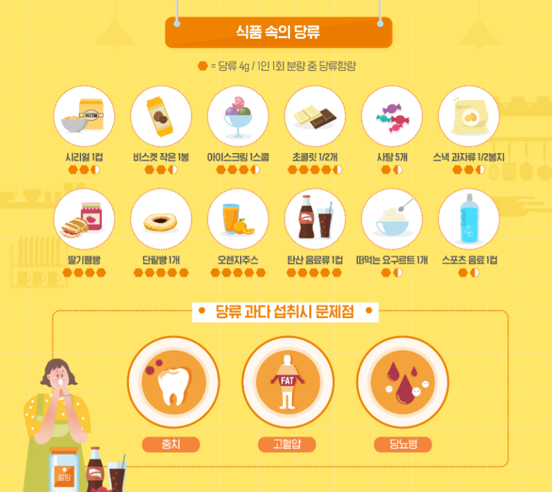 가공식품을 통한 당의 섭취는 1일 50g 정도가 적당하며, 당류 섭취가 많아 졌을 때 '충치', '고혈압', '당뇨병' 등을 유발할 수 있다고 합니다. 예를 들어 탄산음료나 오렌지쥬스 1컵에 20g, 딸기쨈 빵 1개에 16g 등으로 군것질을 조금만 한다고 해도 50g을 쉽게 넘을 수 있습니다. 때문에, 신선식품을 주로 이용하고, 달지 않게 먹으며 음료수 대신 물을 마시는 습관으로 설탕을 적게 섭취해야 조금 더 건강하게 살 수 있습니다.
