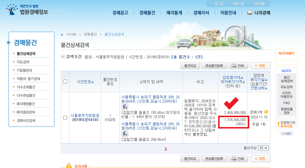 경매물건 - 물건상세검색 에 들어가시고, 법원소재지와 사건번호만 입력하셔도 결과가 나옵니다.