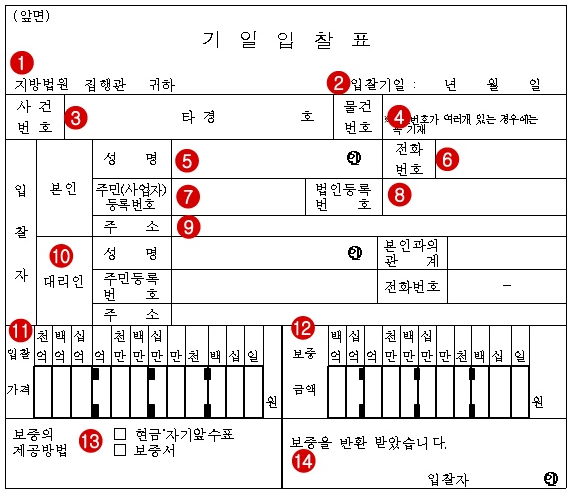 지난 포스팅에서 올려드린 기일입찰표 양식은 위와 같이 생겼는데요, 입찰표를 작성하면서 주의해야하는 부분에 대해서 하나씩 말씀드려보겠습니다.