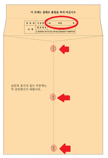 3. 뒷면에도 입찰봉투와 같이 세군데 도장을 찍습니다.