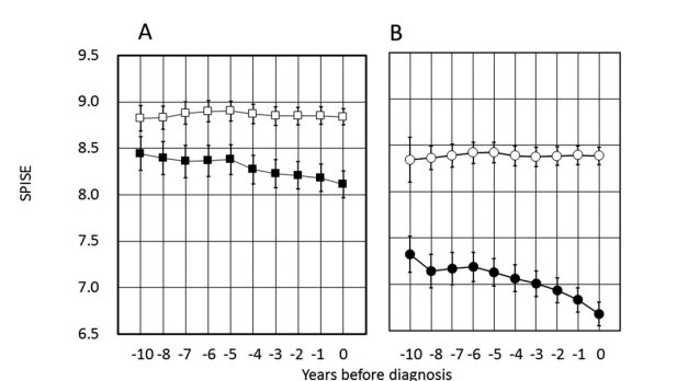 SPISE는 HDLc, TG, BMI 수치들의 종합적인 결과로, 높을 수록 좋습니다. B그래프를 보면, 당뇨병 환자로 발전하는 사람은 SPISE가 처음부터 나빴고, 인슐린 저항성이 점차 심해지고 있는 것을 알 수 있습니다.