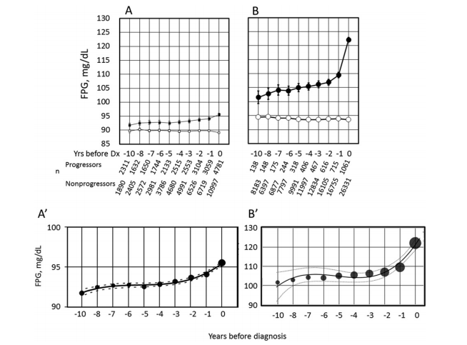 A' 정상에서 당뇨병 전단계의 혈당으로, 시간에 따라 점진적이고 B' 정상(전단계포함)에서 당뇨병으로 발전하는 것은 급격하게 됨을 알 수 있습니다. B'에서도 110 수준에서 급격히 진행되는 것을 확인할 수 있습니다.