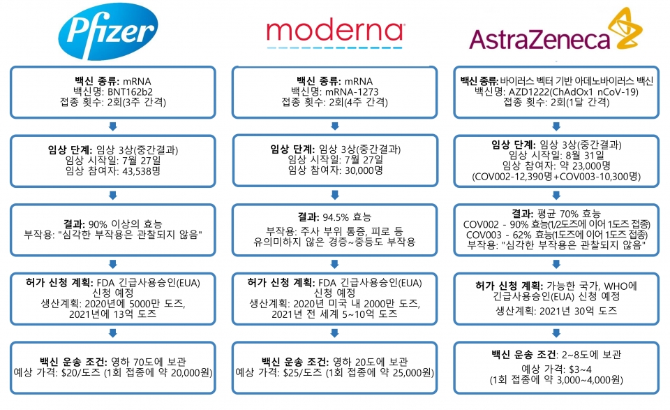 위의 세 백신 모두 한달의 간격을 두고 2회 접종해야 합니다. 다만, 상세 정보가 있는 논문이 발표되지 않은 상태이고 긴급보도 방식으로 발표되어 일부에서는 안전성과 효과에 우려를 제기하기도 합니다. 항체 유지기간이 1년 정도로 추정되는 수준이기 때문입니다. 하지만 코로나 팬더믹 상황에서 백신을 맞는 것에 대한 이익이 더 크기 때문에 위의 세 제약사들은 미국 보건당국에 긴급사용승인을 신청해 생산량을 확보해 놓을 예정입니다. 다음달 12월 쯤 승인이 날 예정이라고 합니다.
