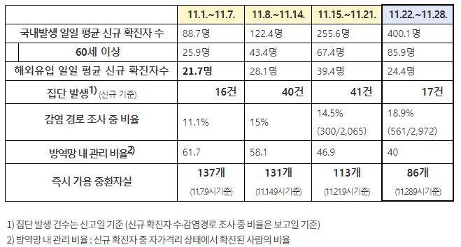 지난 토요일(11월 28일) 기준 자가격리 관리 대상자는 총 66,045명이고, 국내 발생 자가격리자는 41,187명이었습니다. 사회적 거리두기 관리해서는, 2단계 조치 후 각 지자체에서 식당과 카페 21,160개, 미용실 2,047개 등 총 약 3만개소를 점검해서 112건에 대해 현장지도를 한 바 있습니다. 다만 위의 표에서 보는 것과같이 일일 평균 신규 확진자 수가 100명대에서 보름만에 400명을 넘었고, 즉시 가용(인력과 장비가 완비되어 확진자다 당일 입원할 수 있는 병실의 수) 중환자실이 86개 밖에 되지 않는 등 최대한 빠른 대처와 선제적인 정책적 대응이 필요한 시점입니다.