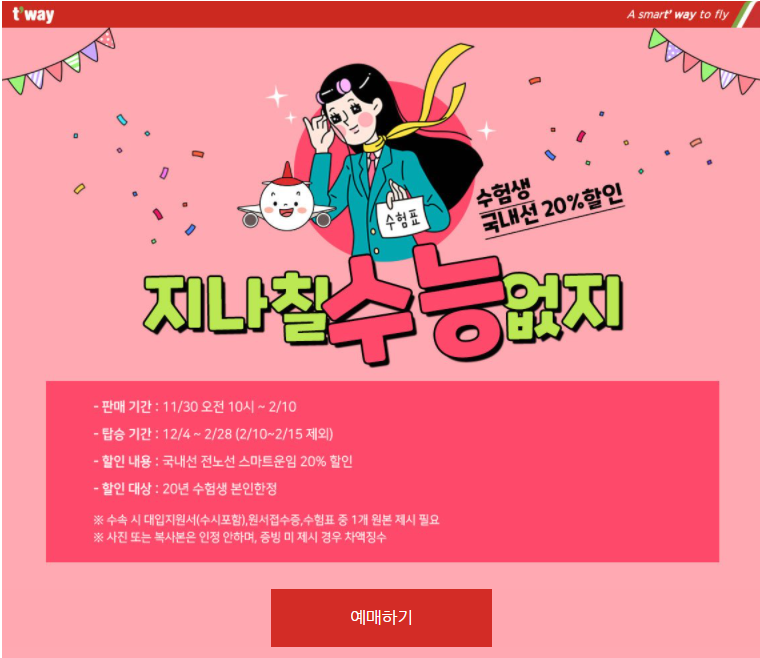 항공사도 이벤트를 진행합니다. 티웨이 항공은 '지나칠 수능 없지'라는 이벤트로 수능을 치른 수험생에게 항공권 할인 혜택을 제공합니다. 홈페이(www.twayair.com/app/promotion/event/retrieve/nk6WkpSmEWsn87Ql1HaCVA==/being/n?)에서 확인이 가능합니다.