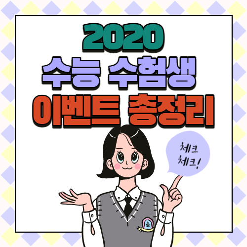 참 2020년도 수능 수험생 이벤트를 정리하다보니 몇년 전과는 다르게 아쉬운 이벤트들이 많네요. 여러모로 올해 수험생은 코로나로 제대로 수업을 받지도 못했고, 시험이 끝나고 나서도 마음껏 즐길 수 없을테니 안타까운 마음이 듭니다.