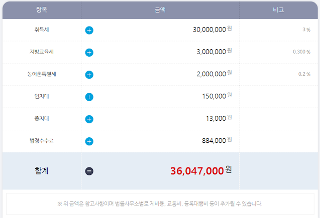 예를들어, 위의 표에서와 같이 10억원 짜리 아파트를 산다고 가정했을 때, 세금과 수수료를 포함하면 최소한 3600만원 정도가 나오는데,