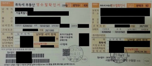 취득세 납부 영수증(관공서제출용, 납부자보관용 총 2장)