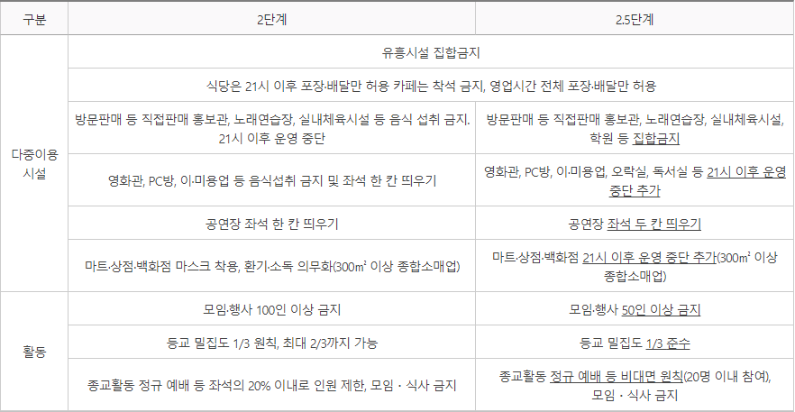 코로나 2단계와 2.5단계에서 유흥시설에 대한 집합금지명령은 같고, 식당은 9시 이후, 카페는 영업시간 전체 포장과 배달만 허용하는 것은 같습니다. 그러나 2단계에 비해서 2.5단계에서는 우리가 자주 접하는 시설들에 대해서 추가적인 거리두기가 시행되게 되었습니다. 가장 중요하게는 노래방, 헬스장 등 금지 영화관, PC방, 미용실, 독서실 등은 오후9시 이후 금지, 마트, 백화점, 상점 오후 9시 이후 금지, 모임 50인 이상 금지, 교회 등 종교 비대면 원칙 등이 크게 달라졌습니다. 자세한 내용은 아래의 표를 참고해주세요.