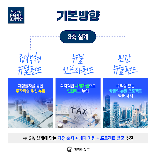 정부의 목표는 낮아진 시중금리에 비해 제한된 투자처로 인해 갈 곳 없는 자금을 뉴딜펀드를 통해서 흡수하려는 의도가 깔려 있습니다. 정부는 펀드 등을