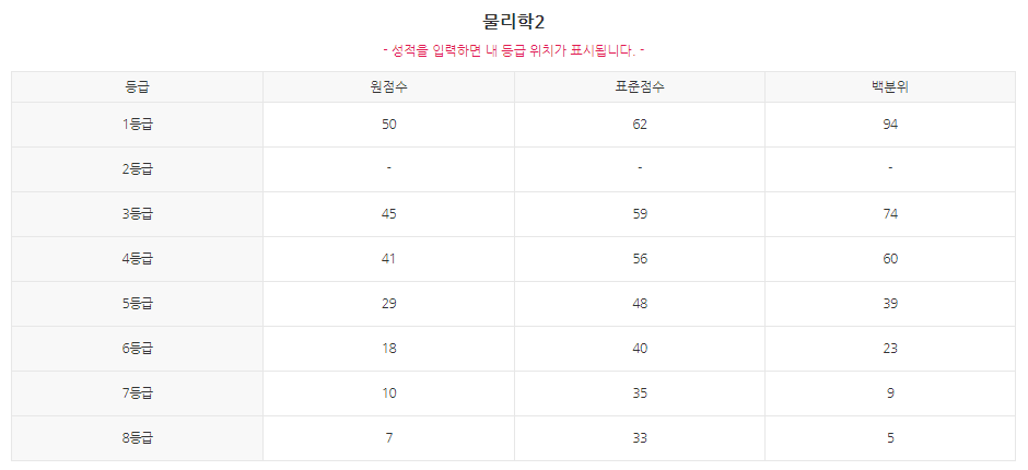 과탐 - 물리학2 수능성적표 최종 등급컷 보기