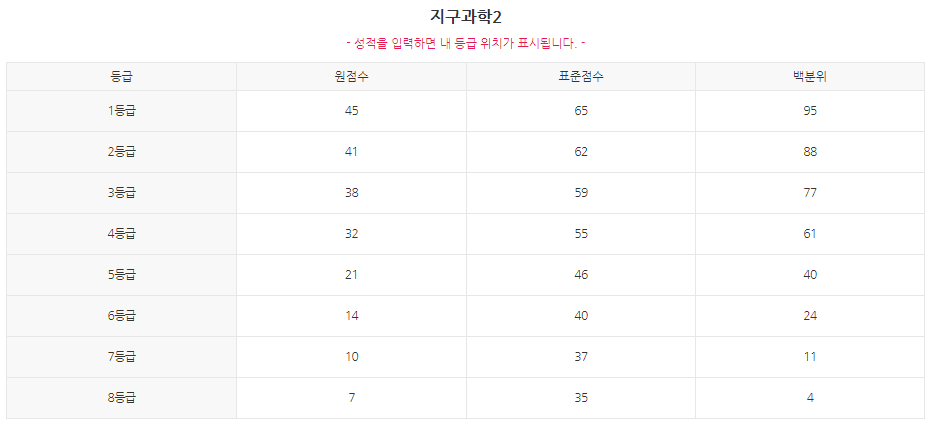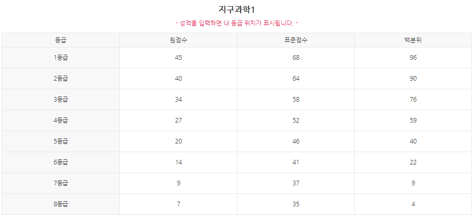 과탐 - 지구과학 수능성적표 최종 등급컷 보기