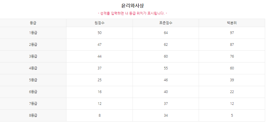 사탐 - 윤리와 사상 수능성적표 최종 등급컷 보기