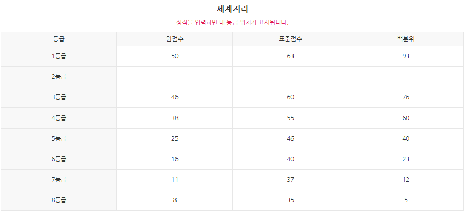 사탐 - 세계지리 수능성적표 최종 등급컷 보기
