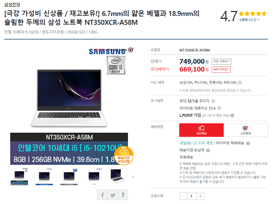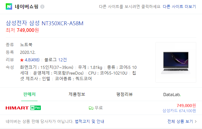 마지막으로 하이마트 빅하트세일에서 MD 픽으로 광고되는 상품을 알아봤습니다. 6.7mm의 얇은 베젤과 18.9mm의 슬림한 두께의 삼성 노트북 NT350XCR-A58M인데요. 역시 네이버 최저가와 비교해봤습니다.