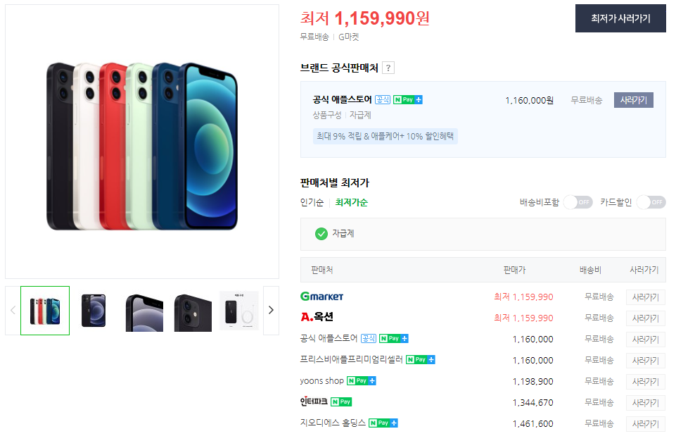 아이폰 같은 경우 네이버 최저가가 더 저렴하네요. 하지만 카드 할인 등도 함께 꼭 살펴보세요.