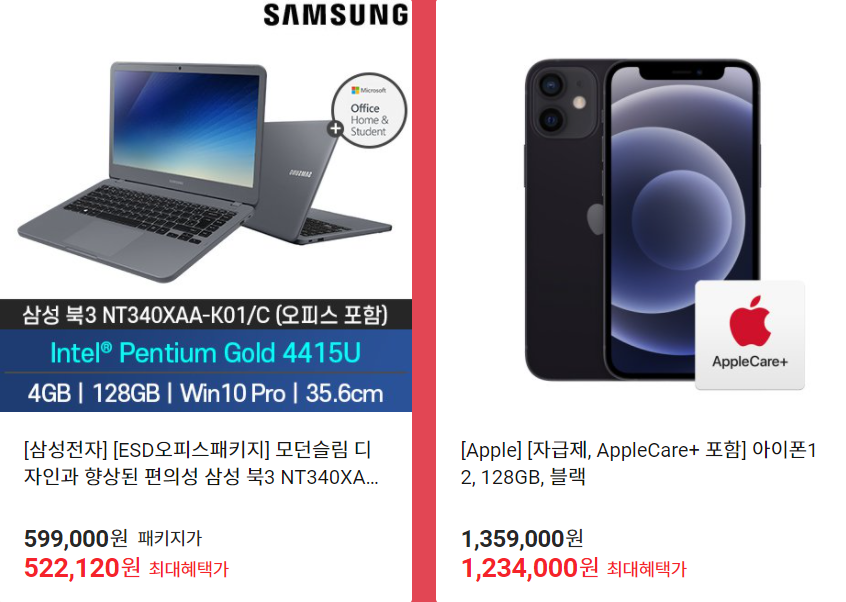 이 외에도 삼성노트북과 아이폰 자급제도 할인주입니다. 아이폰12 128GB 의 경우 정상가 1,359,000원에서 할인시 1,234,000 까지 가능합니다.