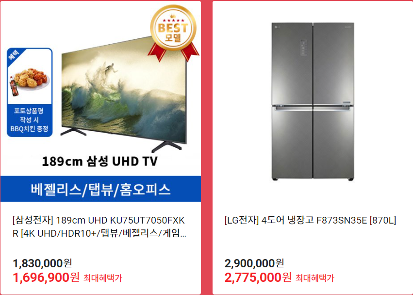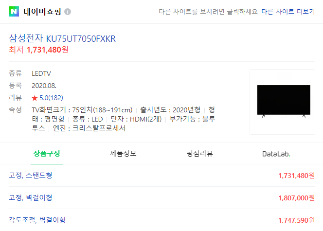 일단 삼성전자 189cm UHD KU75UT7050FXKR [4K UHD/HDR10+/탭뷰/베젤리스/게임모드] 의 경우 정상가 1,830,000원에서 최대 1,696,900원까지 할인이 가능합니다.
