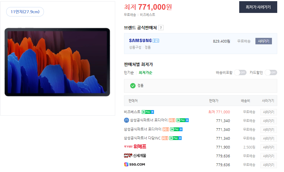 네이버 최저가와 비교를 해봤는데. 삼성 태블릿 PC 갤럭시탭 s7의 경우 최저가로 구입이 가능한 것을 확인했습니다. 이런 제품은 사려고 계획 중이시라면 바로 지르셔도 후회는 없으실 것 같네요.