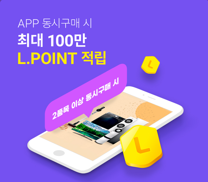 또한 위의 그림과 같이 하이마트 모바일 앱을 통해 2개 이상 구매시 최대 100만점 L포인트 증정행사와 5% 추가적립행사가 있다고 합니다.