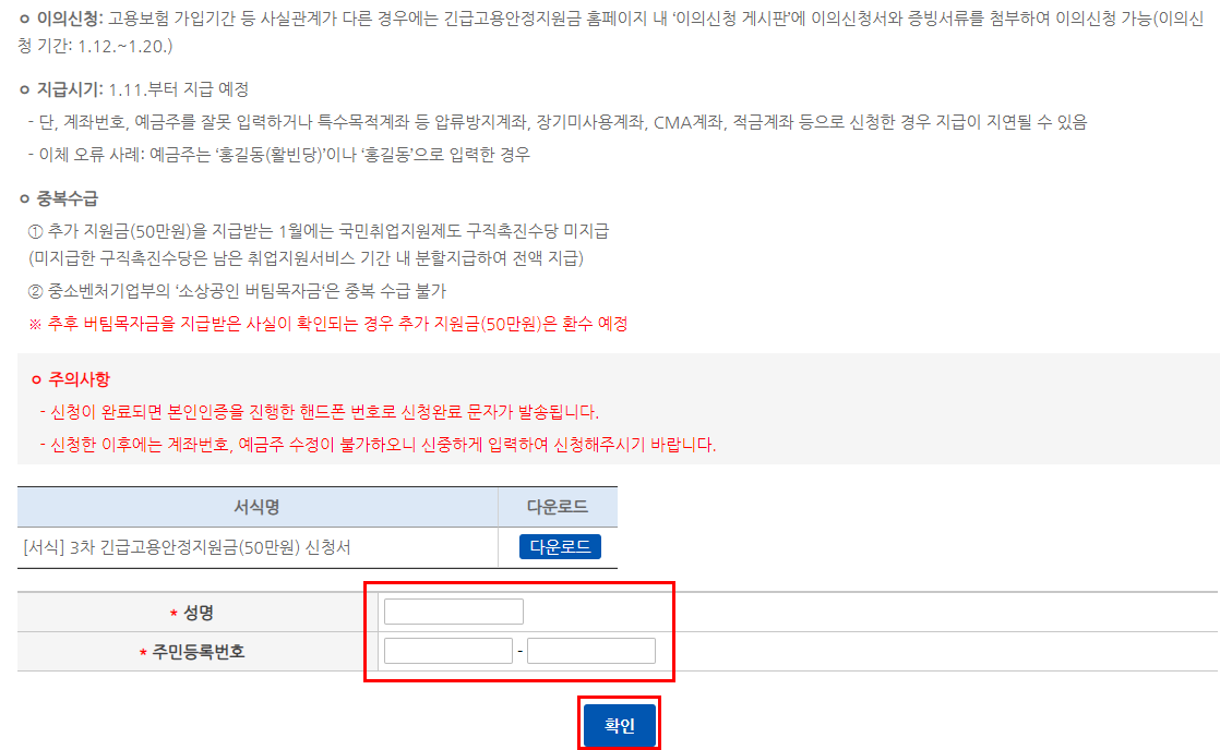 2. 1차와 2차 지원금 수혜를 받으신 분은 위의 빨간표 '1차,2차 수혜자 추가 지원금(50만원) 신청'을 클릭합니다.