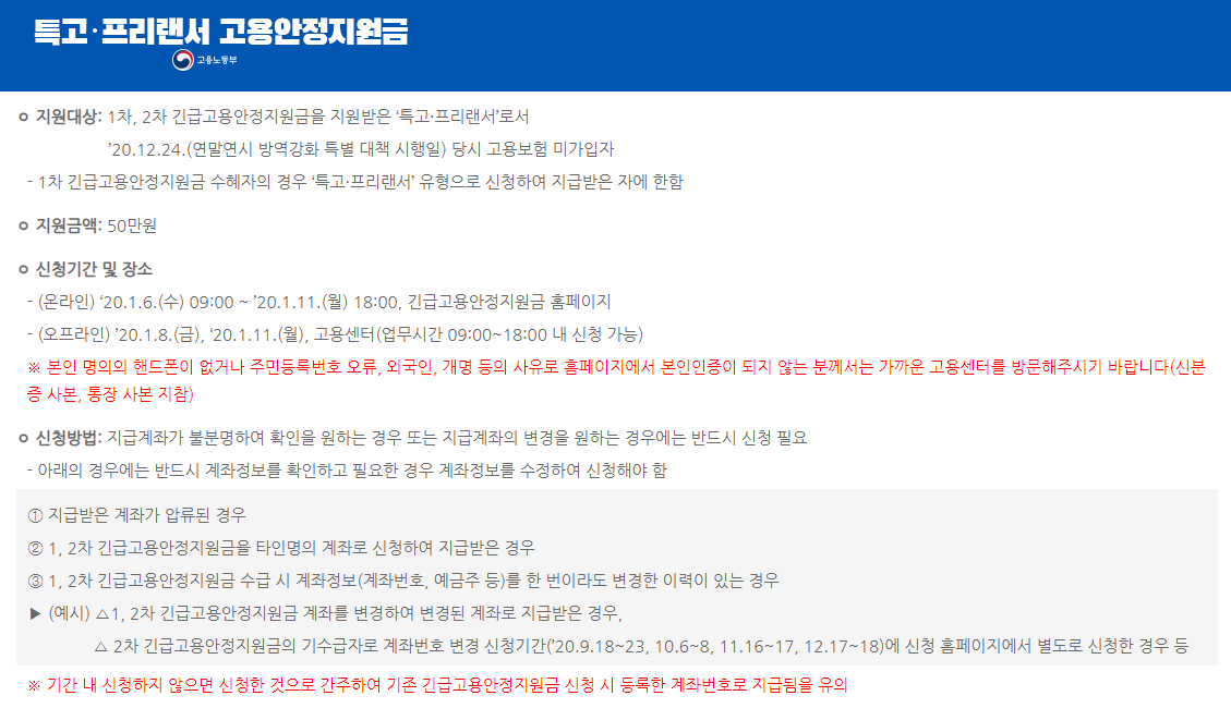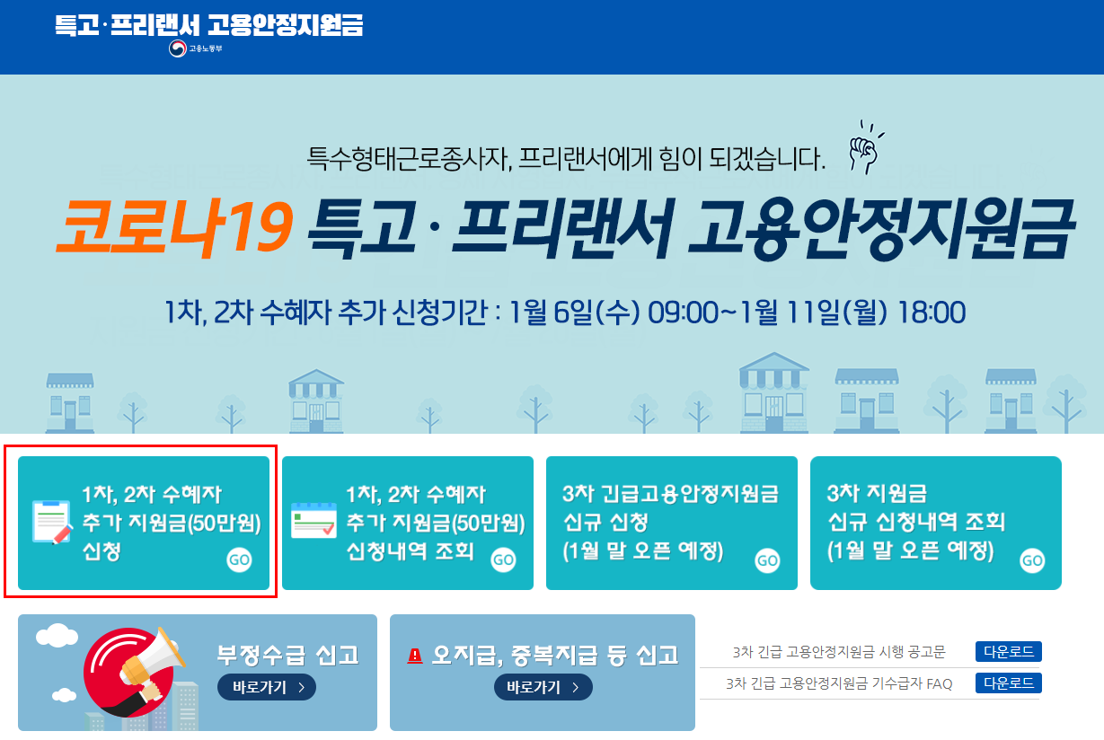 현재는 1차, 2차를 신청했던 특고, 프리랜서가 대상이만 기존에 지원받지 않은 특고, 프리랜서는 2월에 신청이 가능합니다. (2~3월에 100만원 지급예정)