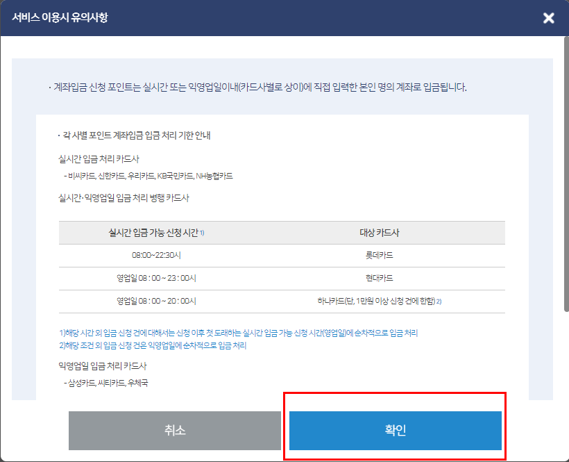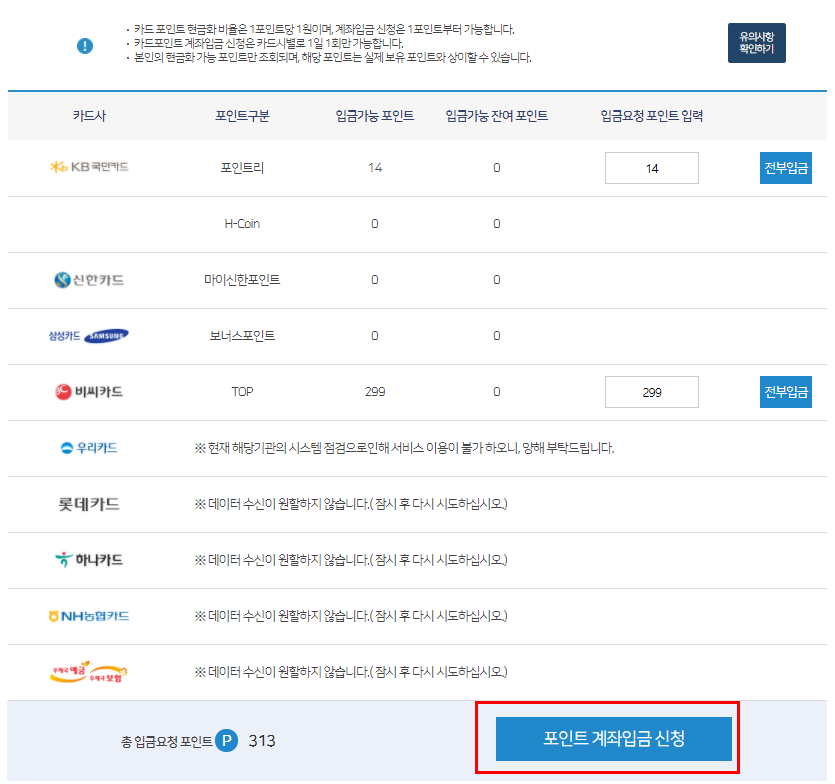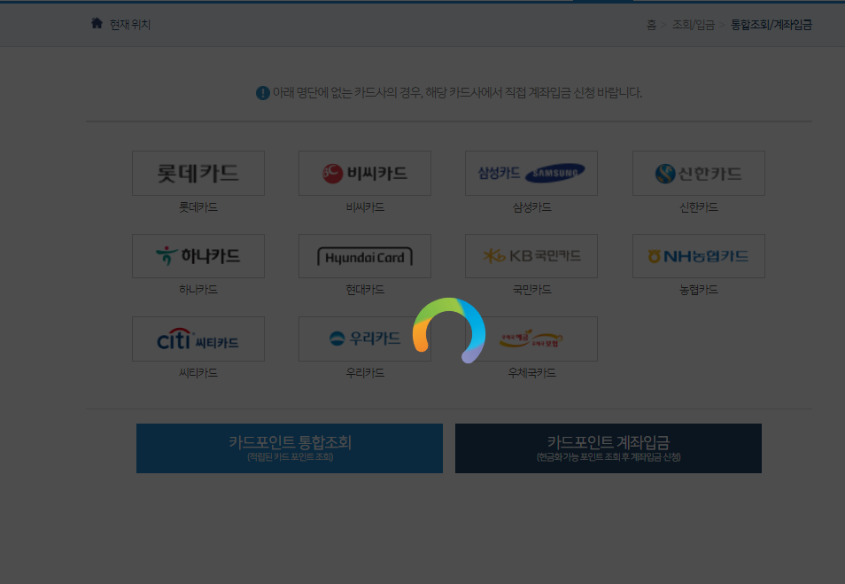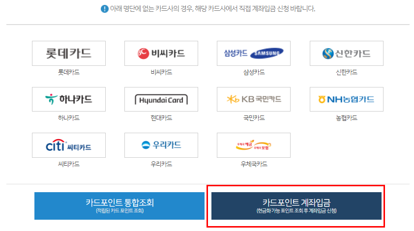 6. 신용카드 포인트 조회가 가능한 카드사들이 주르륵 나오네요. 카드포인트 계좌입금을 클릭했습니다.