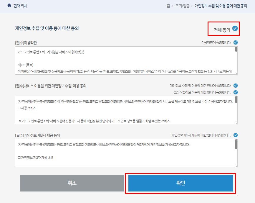 제가 보니 신용카드 포인트 조회 외의 별 내용은 없으니 그냥 전체동의 누르셔도 괜찮습니다.
