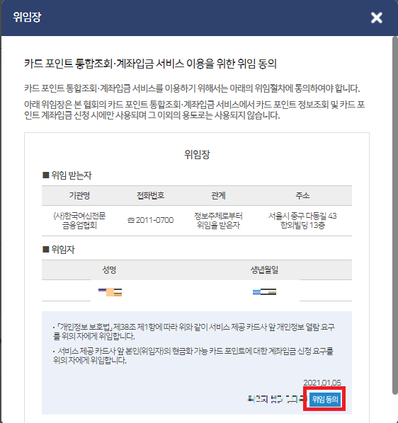 4. 카드 포인트 통합조회, 계좌입금 서비스 이용을 위한 위임동의가 나오는데, 이것도 살펴보니 본인만 조회할 수 있는 신용카드 포인트를 여신금융협회에서 대신 하겠다는 것으로 이 부분에 대한 권리만 위임됩니다. 동의를 클릭했어요.