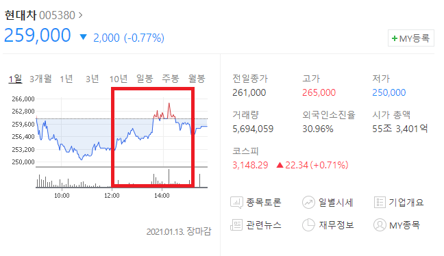 위 그래프는 1월13일자 현대차 주가로, 애플의 팀쿡이 현대차와의 협력을 발표하리라는 예상이 시장에 반영되어 큰폭으로 하락중이던 주가가 일시적으로 반등하는 모습입니다.