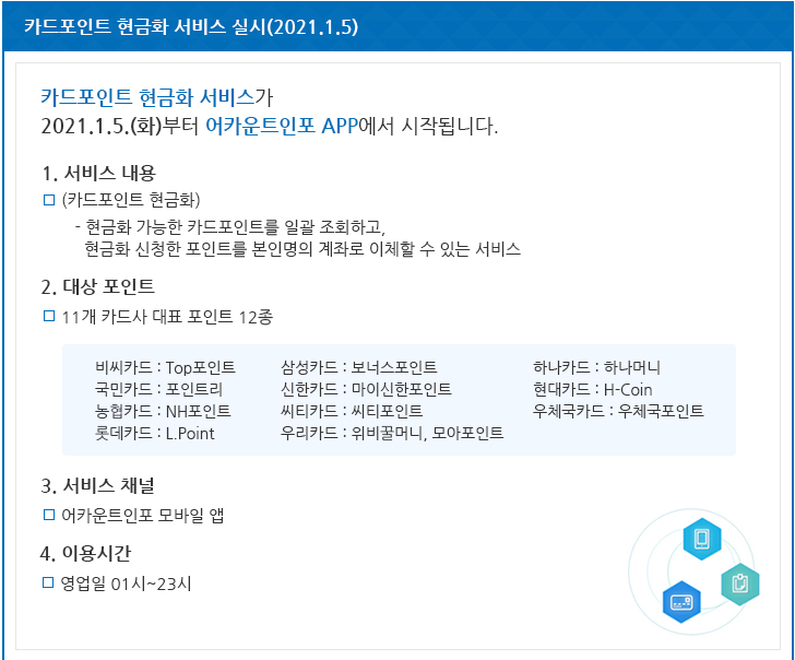 안녕하세요 티케입니다. 오늘은 카드포인트 현금화 방법 그 두번째, 어카운트 인포 앱(어플)을 이용한 카드포인트 통합조회 및 현금화(계좌입금) 방법에 대해서 알아보겠습니다. 첫번째 방법은 PC를 통해 포인트를 조회하고 현금화 하는 방법이었죠. 신용카드포인트 통합조회, 계좌이체 서비스가 시작된지 7일이 지났는데, 벌써 681만건 신청에 총 778억원이 현금화 되었다고 합니다. 하루평균 91만건, 하루 103억원이 카드포인트에서 현금으로 전환되었다는 뜻입니다. 금융위원회와 여신금융협회는 카드포인트 통합조회를 하면서 휴면계좌나 예치금 등을 현금화 하는 건수도 크게 늘었다고 밝혔습니다. 자투리 포인트나 휴면계좌를 찾아서 생활에 조금이라도 도움이 되면 좋겠습니다. 카드포인트 현금화 방법 중 어카운트인포 앱을 이용한 방법을 자세하게 알아보도록 하겠습니다.