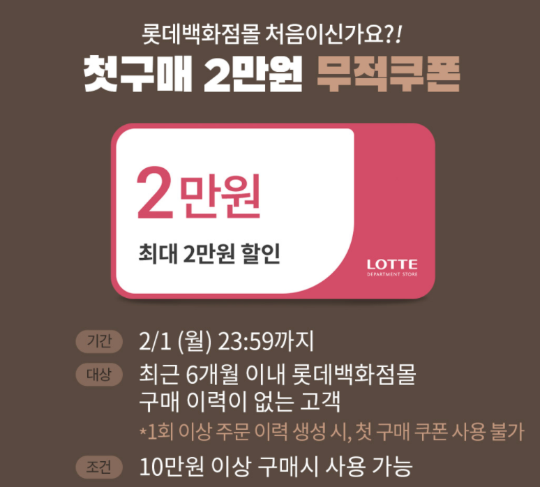 롯데백화점에서 구매한 이력이 없다면 2만원 할인이 추가로 가능합니다.