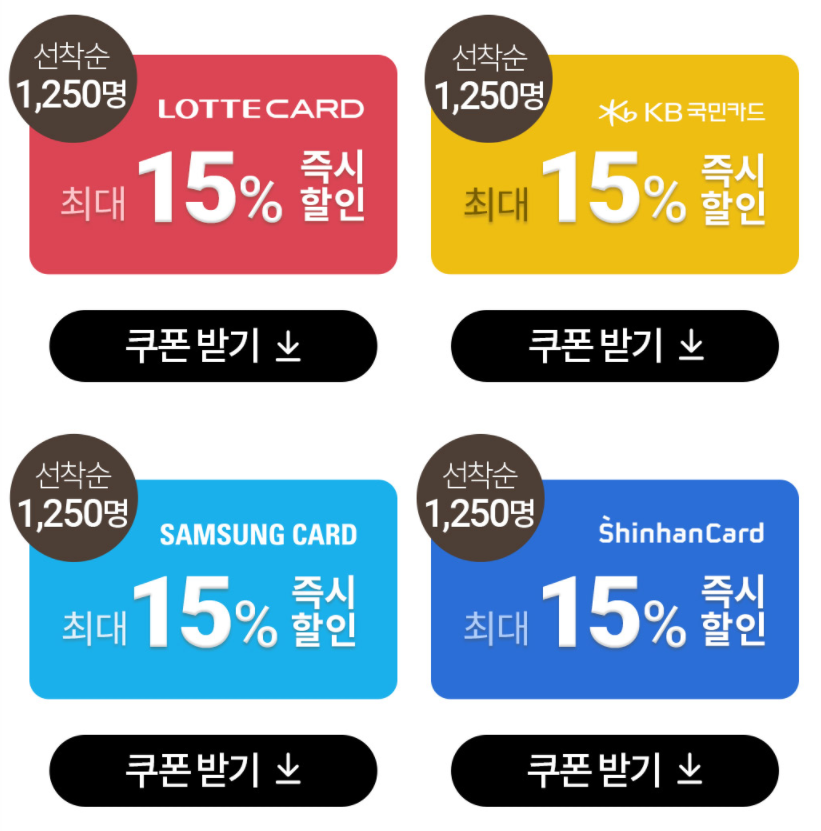 롯데온에서는 위처럼 4대 카드사의 15% 할인쿠폰을 제공합니다. 1,250명씩 선착순이기 때문에 지금 가서 받아 놓으시는 것이 좋을 것 같습니다.